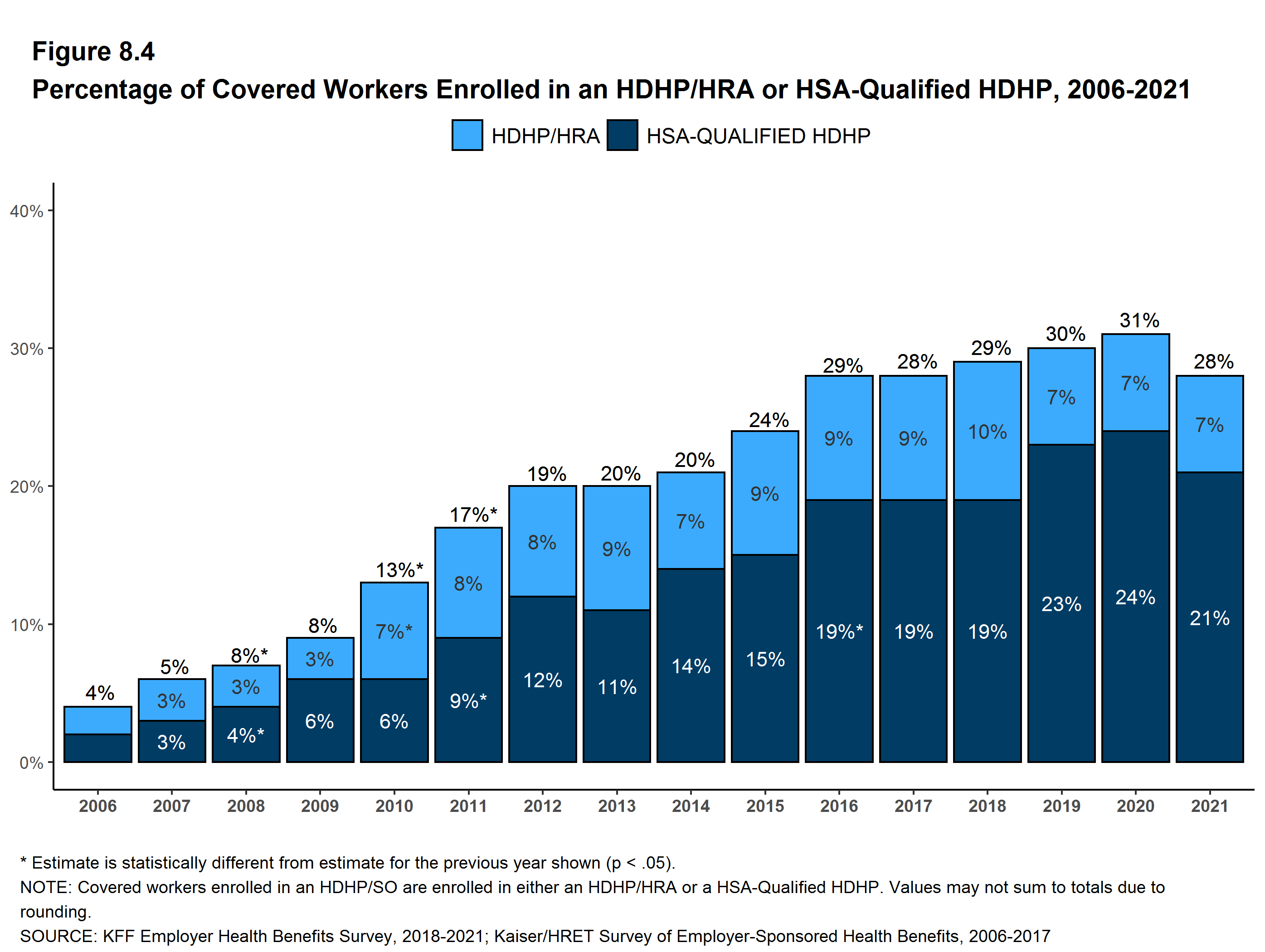 Percentage of covered workers enrolled in an HDHP/HRA or an HSA-Qualified HDHP, 2006-2021