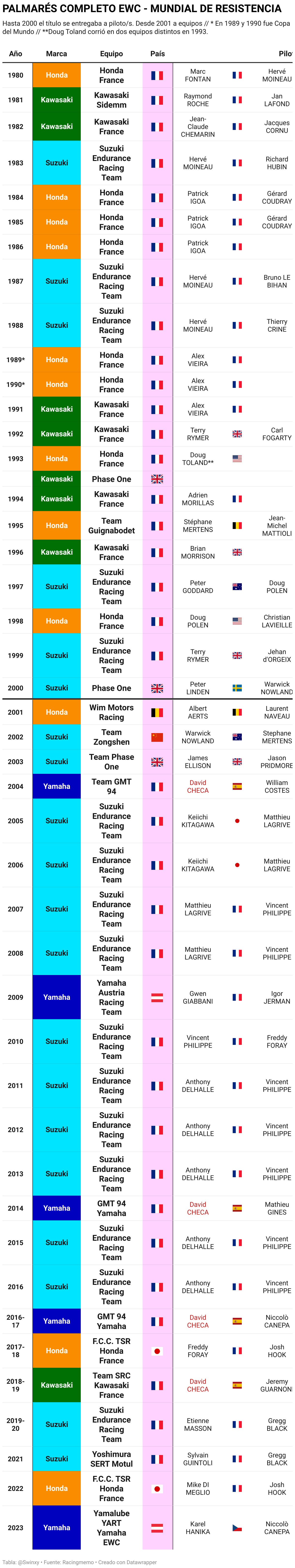 Hasta 2000 el título se entregaba a piloto/s. Desde 2001 a equipos // * En 1989 y 1990 fue Copa del Mundo // **Doug Toland corrió en dos equipos distintos en 1993.