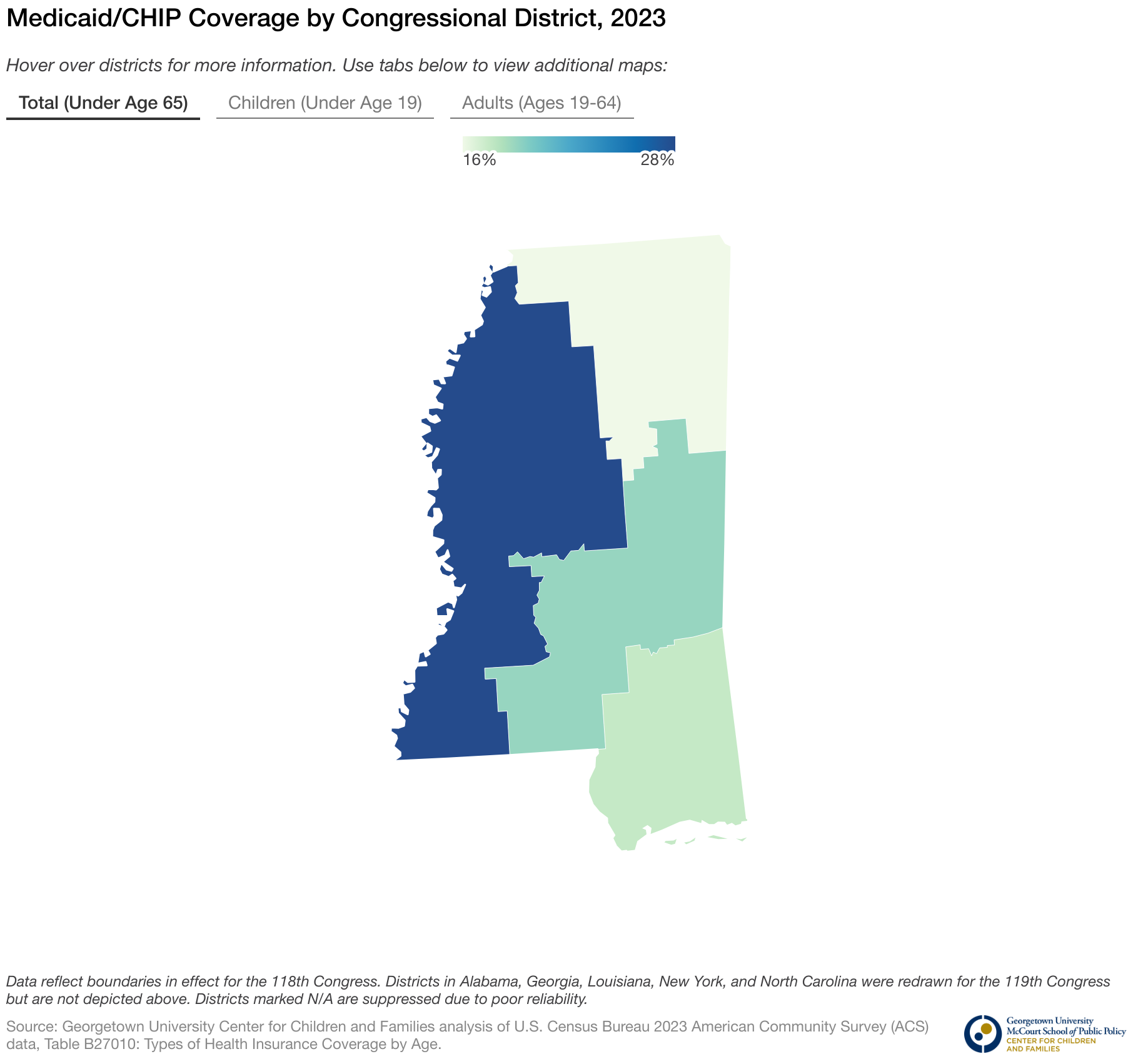 Hover over districts for more information. Use tabs below to view additional maps: Total (Under Age 65) Children (Under Age 19) Adults (Ages 19-64)
