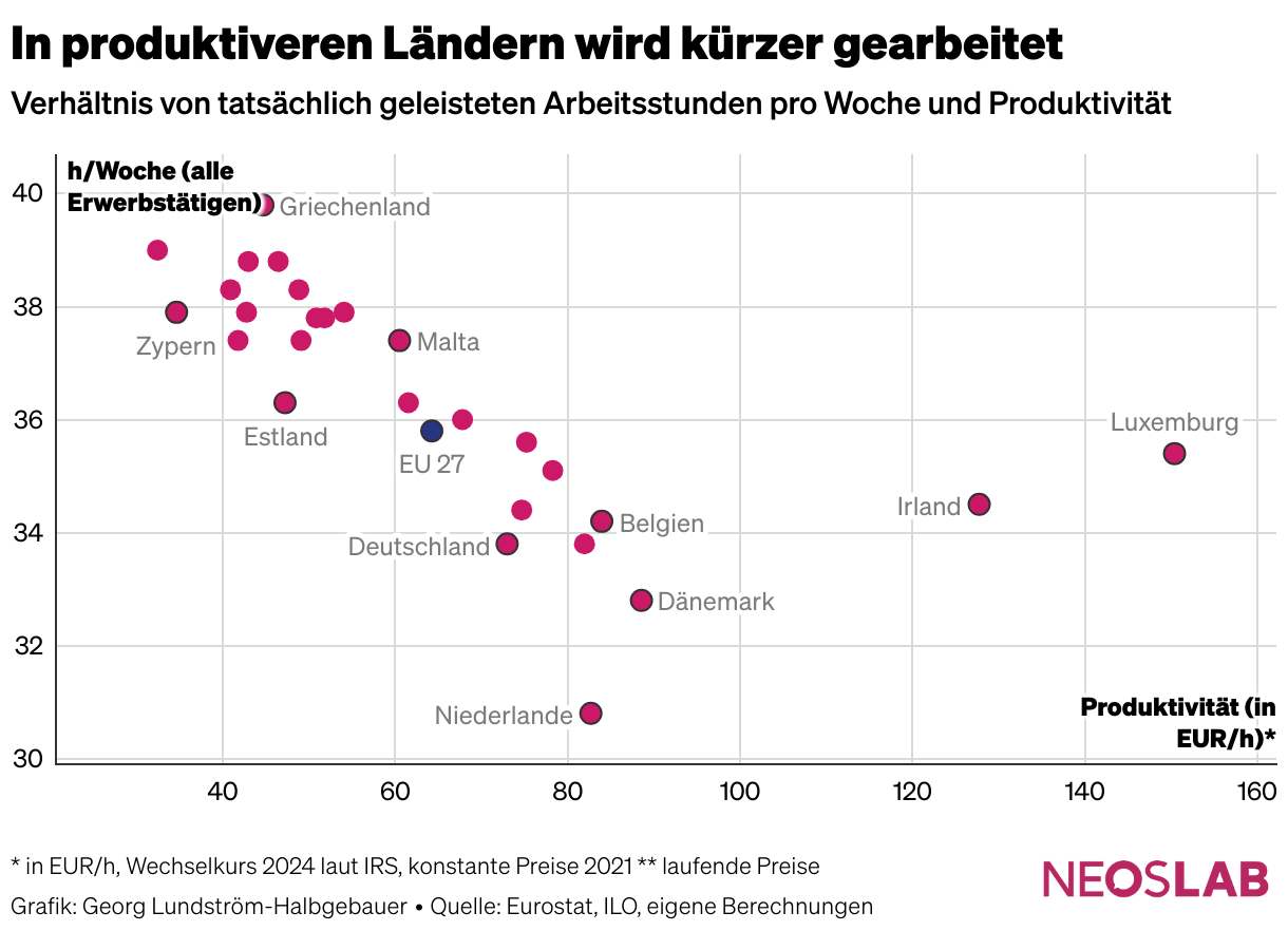 Verhältnis von tatsächlich geleisteten Arbeitsstunden pro Woche und Produktivität