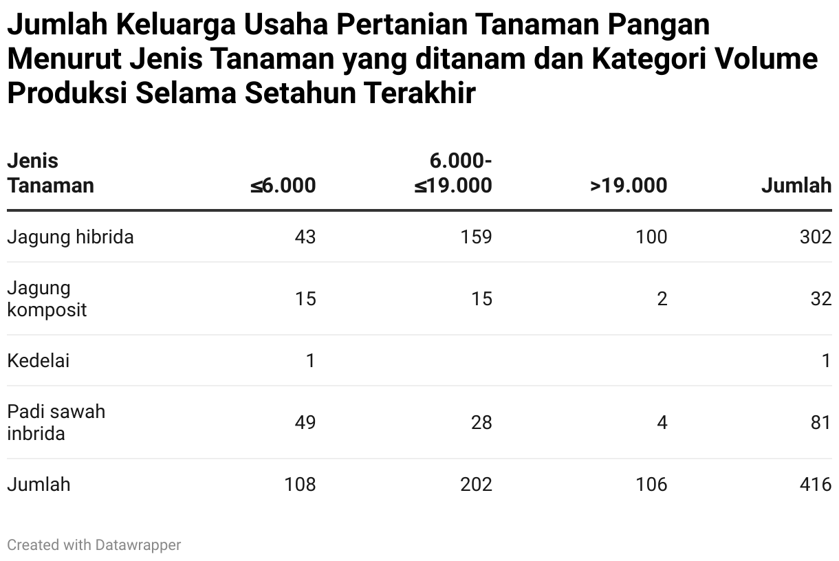 Jumlah Keluarga Usaha Pertanian Tanaman Pangan Menurut Jenis Tanaman yang ditanam dan Kategori Volume Produksi Selama Setahun Terakhir