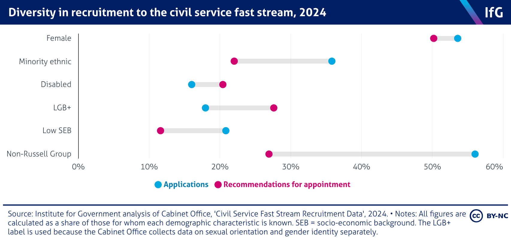 A dot plot from the Institute for Government showing diversity in recruitment to the civil service fast stream, 2024, where the share of successful candidates who are disabled and LGB+ is larger than the share of applicants with those characteristics. The proportion of successful candidates who are female or minority ethnic, attended a non-Russell Group university or come from a low socio-economic background is lower than the share of applicants with those same characteristics.