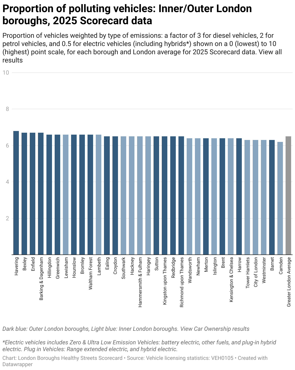 Proportion of vehicles weighted by type of emissions: a factor of 3 for diesel vehicles, 2 for petrol vehicles, and 0.5 for electric vehicles (including hybrids*) shown on a 0 (lowest) to 10 (highest) point scale, for each borough and London average for 2025 Scorecard data. View all results