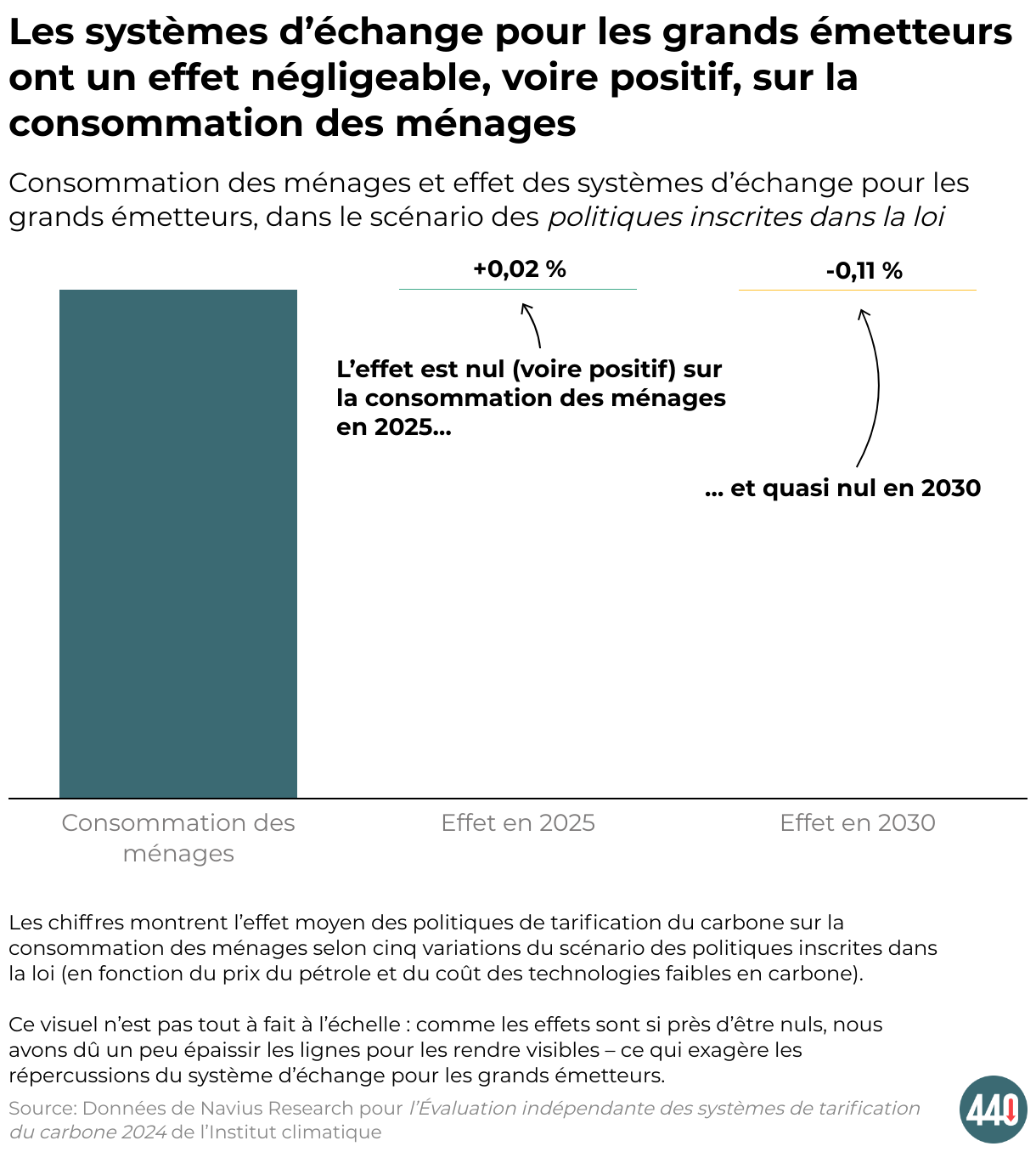 La figure montre l'impact des systèmes d'échange de quotas d'émission de gaz à effet de serre sur la consommation des ménages, exprimé comme la moyenne des cinq scénarios modélisés. En moyenne, les systèmes d’échange pour les grands émetteurs ont un impact nul ou légèrement positif en 2025, augmentant la consommation des ménages de 0,02 %, et ont un impact moyen de -0,11 % en 2030.