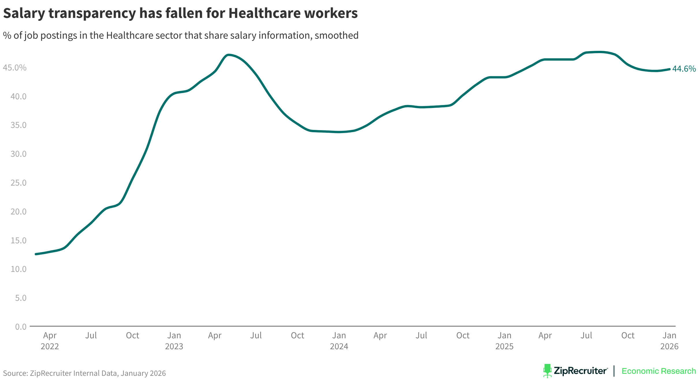 % of job postings in the Healthcare sector that share salary information, smoothed