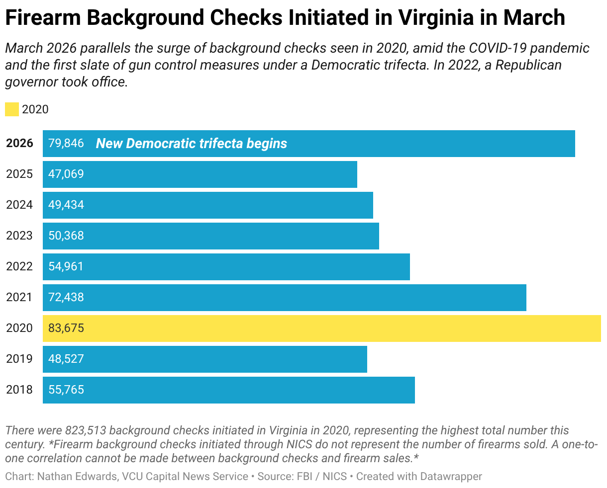 March 2026 parallels the surge of background checks seen in 2020, amid the COVID-19 pandemic and the first slate of gun control measures under a Democratic trifecta.