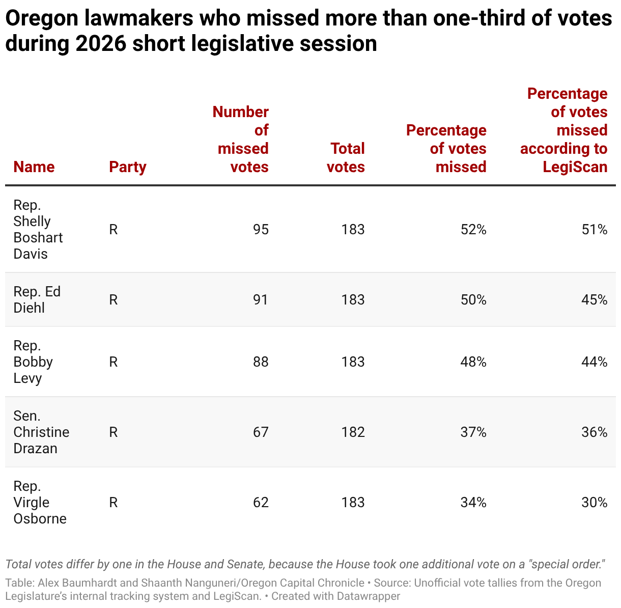 Oregon lawmakers who missed more than one-third of votes during 2026 short legislative session