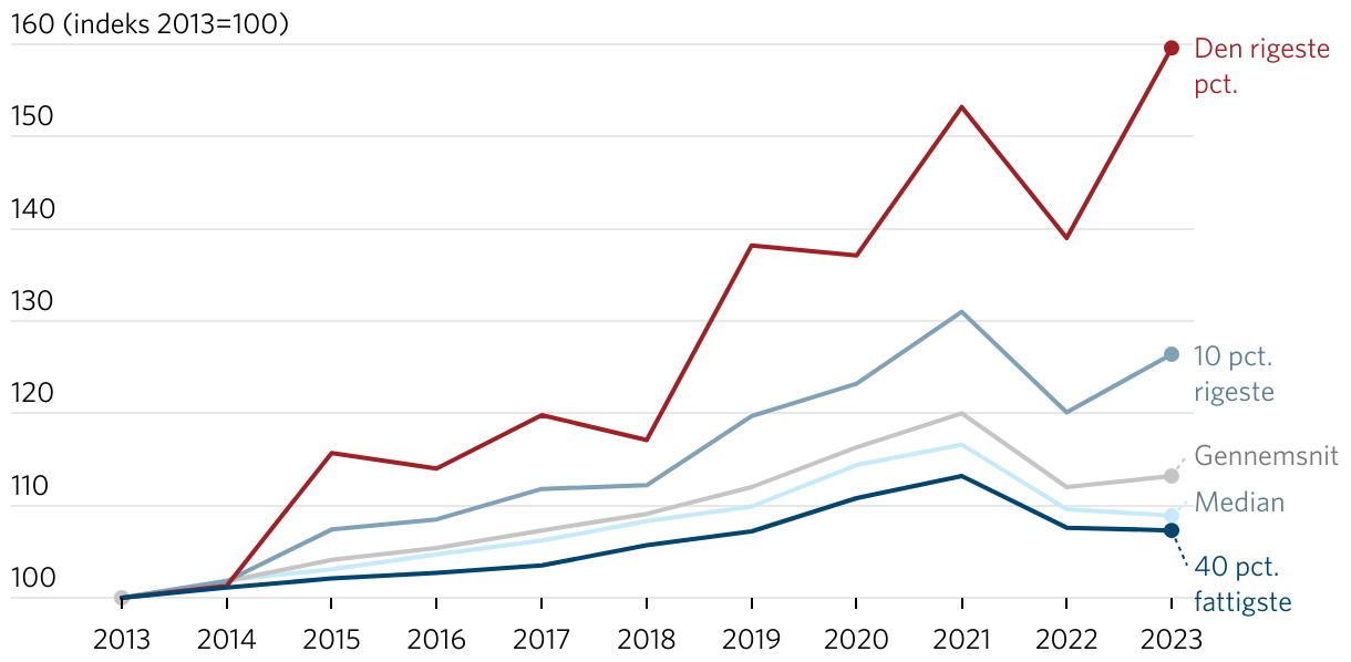 Figuren viser udviklingen i den reale disponible indkomst siden 2013. Udviklingen er opgjort relativt til udgangspunktet i 2013.