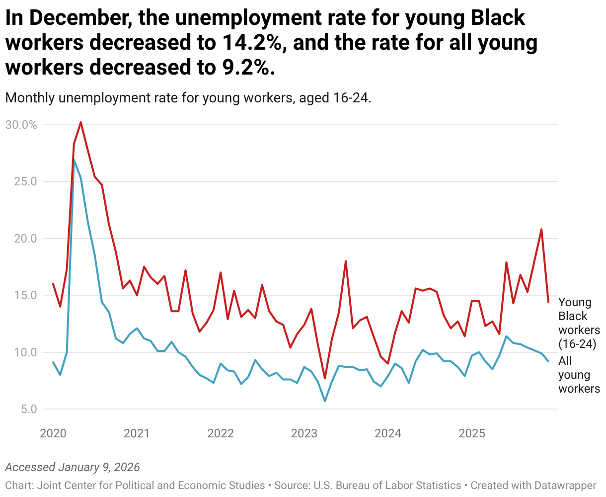 In December, the unemployment rate for young Black workers decreased to 14.2%, and the rate for all young workers decreased to 9.2%.