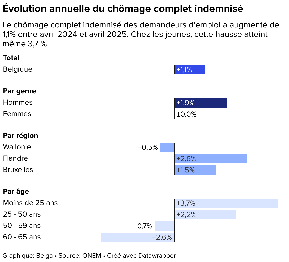 Le chômage complet indemnisé des demandeurs d'emploi a augmenté de 1,1% entre avril 2024 et avril 2025. Chez les jeunes, cette hausse atteint même 3,7 %.