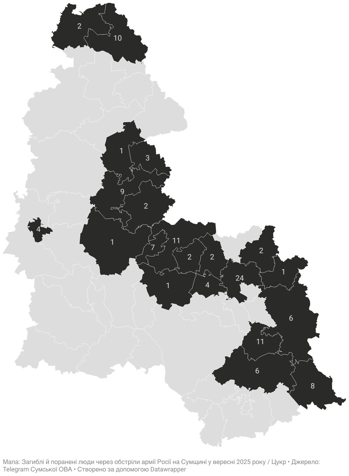 Діаграма: Загиблі й поранені люди через обстріли армії Росії на Сумщині у вересні 2025 року / ЦукрДжерело: Telegram Сумської ОВАЗавантажити зображенняСтворено за допомогою Datawrapper