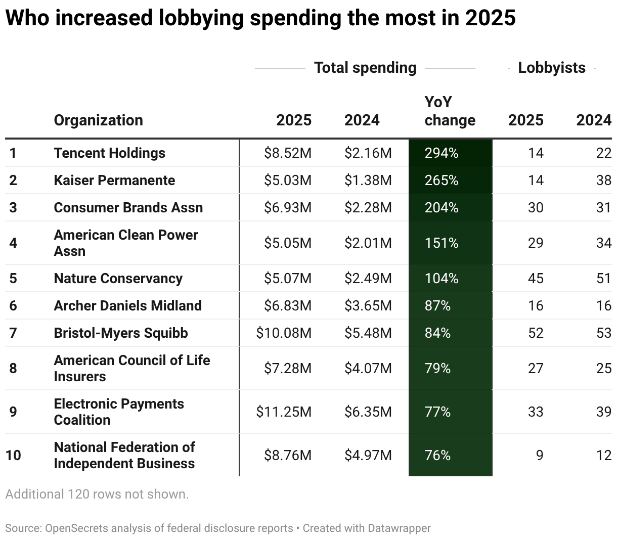 Table with heat map showing percentage growth of clients in issue areas between first three quarters of 2024 and 2025.