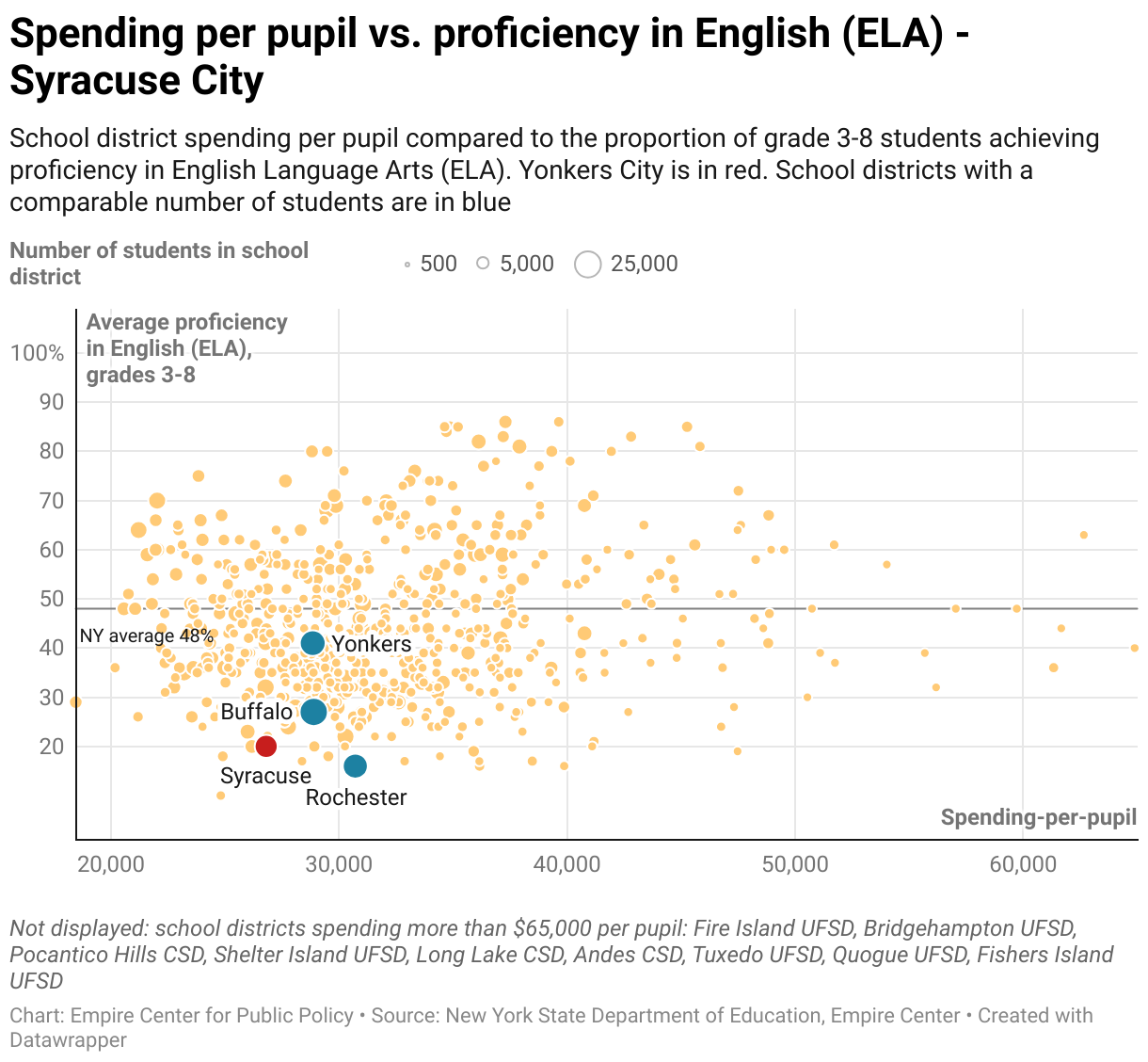 School district spending per pupil compared to the proportion of grade 3-8 students achieving proficiency in English Language Arts (ELA). Yonkers City is in red. School districts with a comparable number of students are in blue