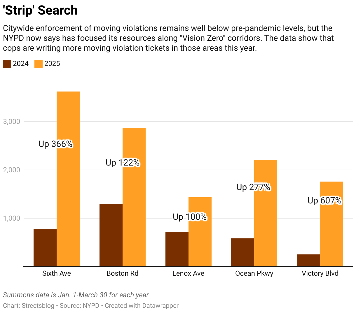 Citywide enforcement of moving violations remains well below pre-pandemic levels, but the NYPD now says has focused its resources along "Vision Zero" corridors. The data show that cops are writing more moving violation tickets in those areas this year.