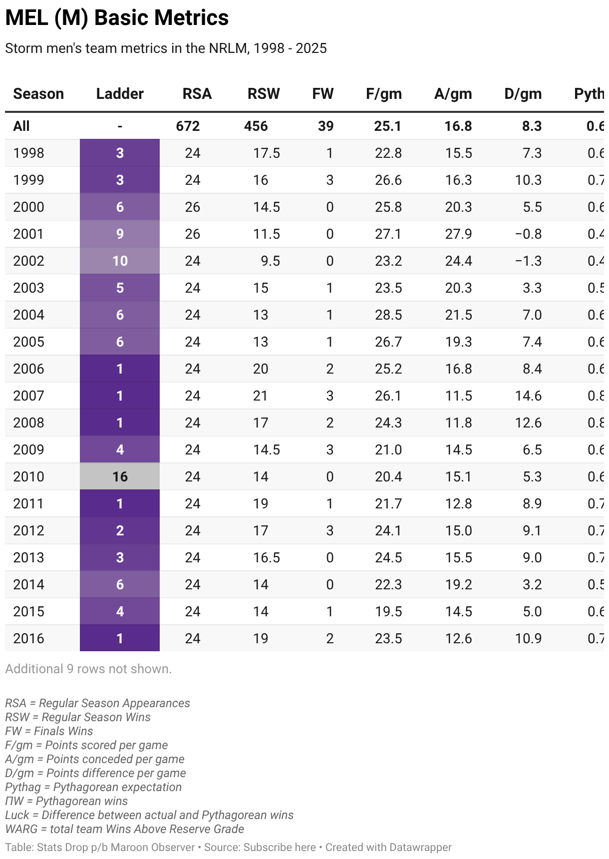 Storm men's team metrics in the NRLM, 1998 - 2025