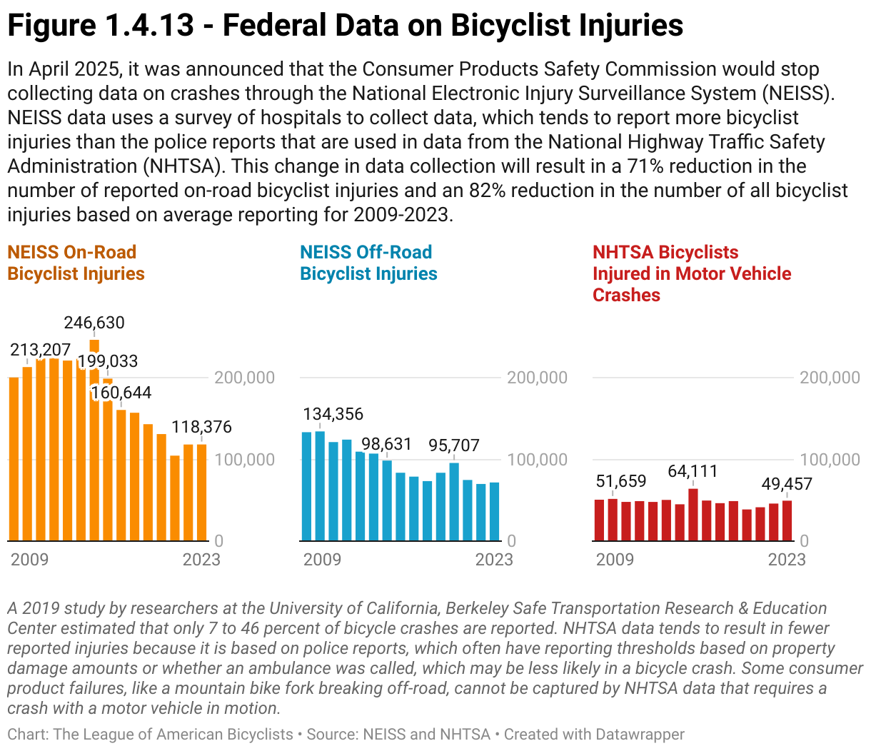 In April 2025, it was announced that the Consumer Products Safety Commission would stop collecting data on crashes through the National Electronic Injury Surveillance System (NEISS). NEISS data uses a survey of hospitals to collect data, which tends to report more bicyclist injuries than the police reports that are used in data from the National Highway Traffic Safety Administration (NHTSA). This change in data collection will result in a 71% reduction in the number of reported on-road bicyclist injuries and an 82% reduction in the number of all bicyclist injuries based on average reporting for 2009-2023.