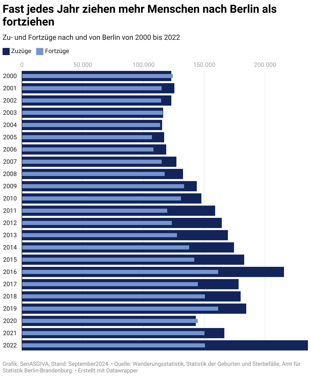 Bis auf die Jahre 2000 und 2020 zogen mehr Menschen nach Berlin als fortgezogen sind. Besonders deutlich war dies in den Jahren 2011 bis 2019 sowie im Jahr 2022.