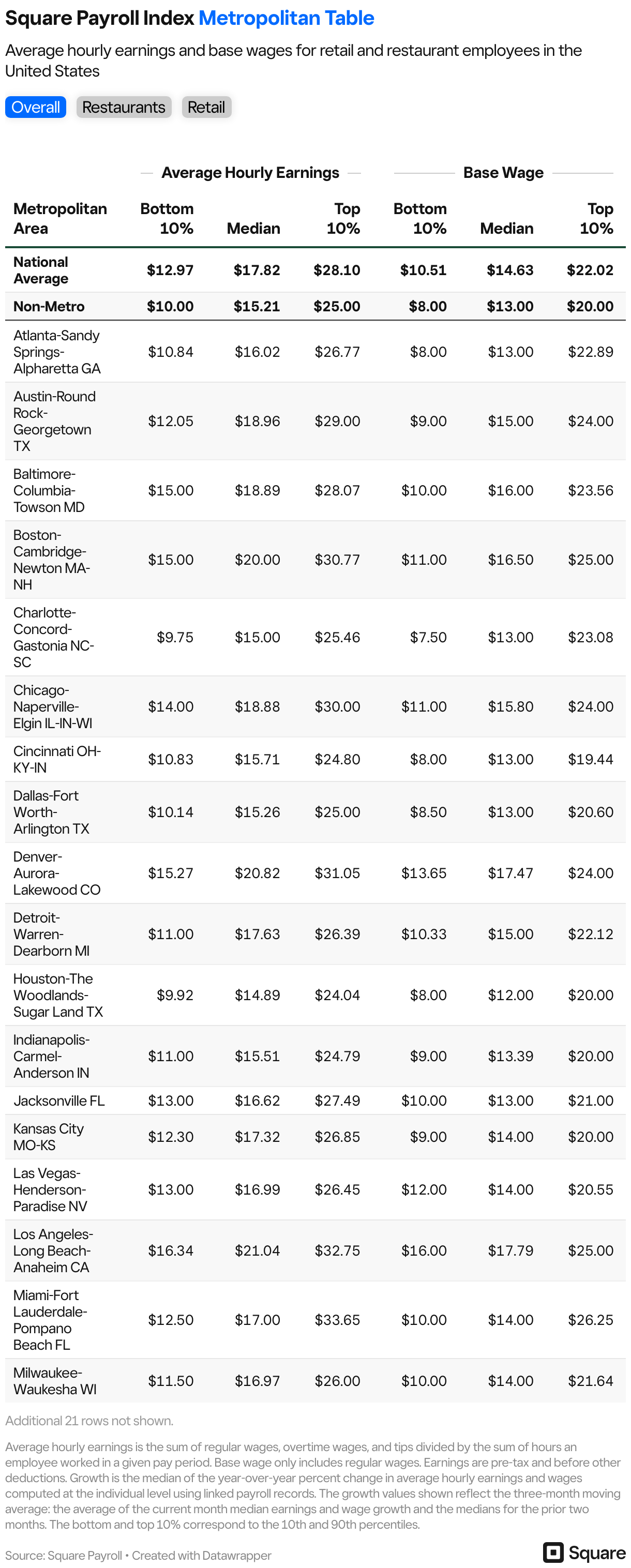 Average hourly earnings and base wages for retail and restaurant employees in the United States Overall Restaurants Retail