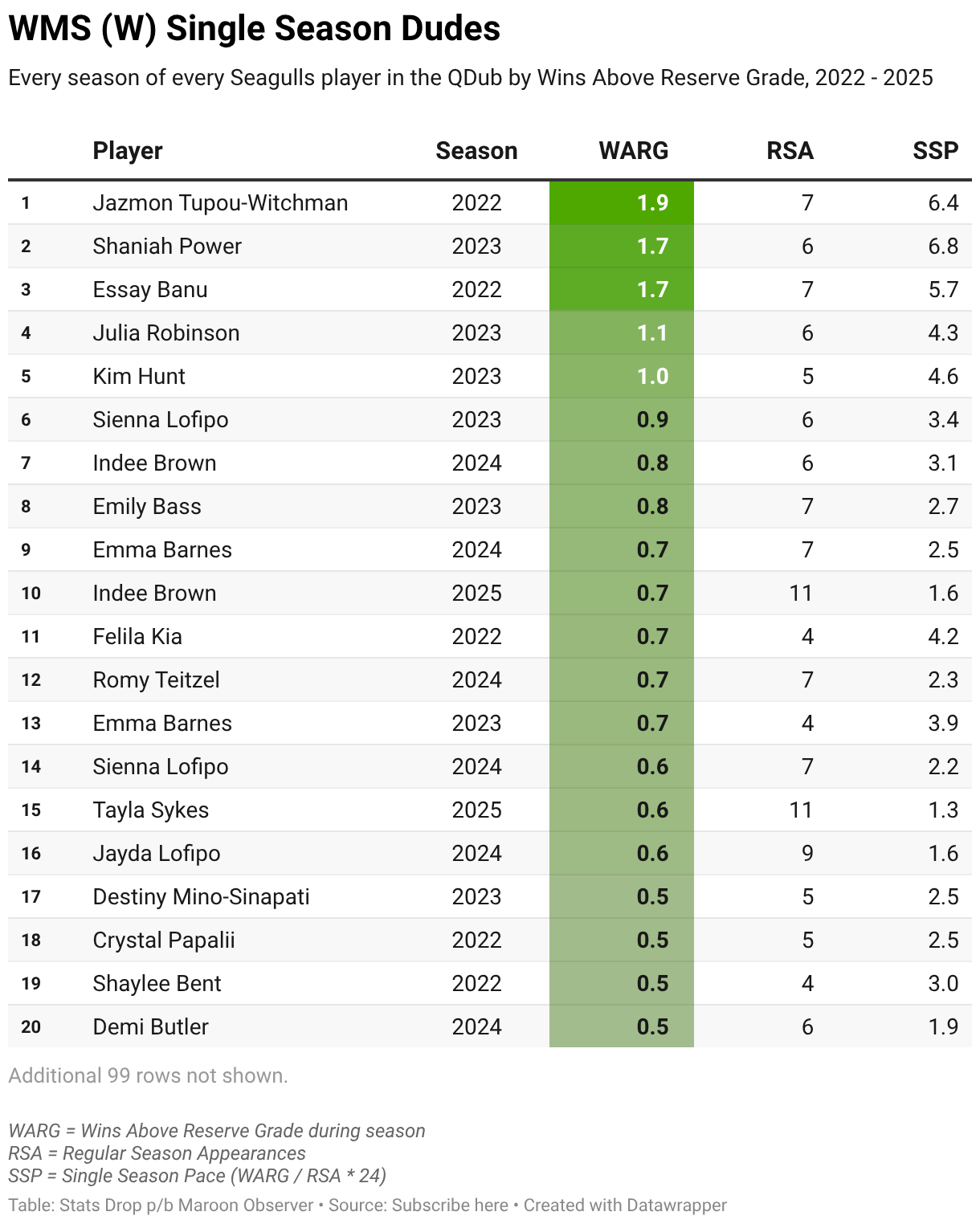 Every season of every Seagulls player in the QDub by Wins Above Reserve Grade, 2022 - 2025