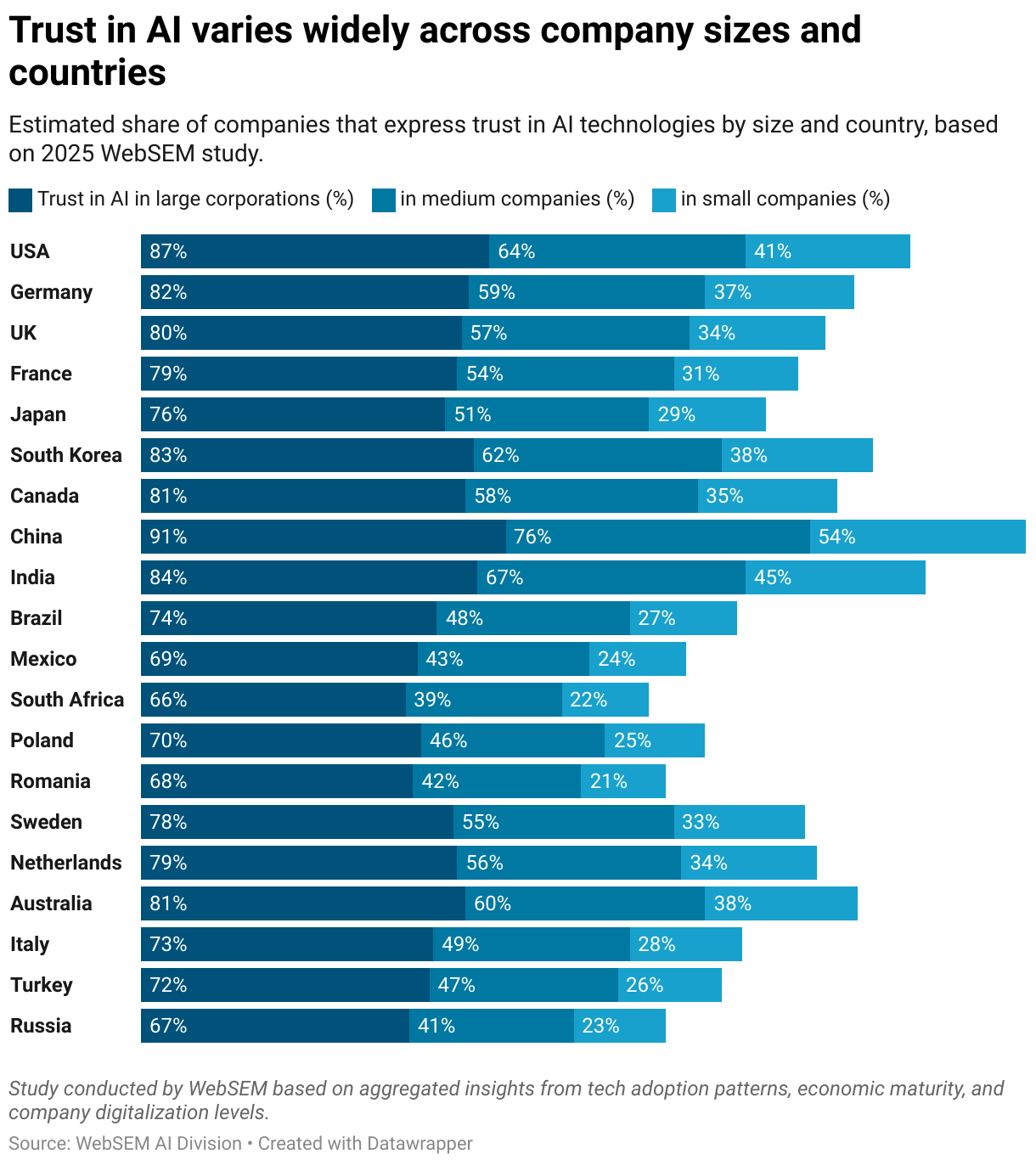 Estimated share of companies that express trust in AI technologies by size and country, based on 2025 WebSEM study.