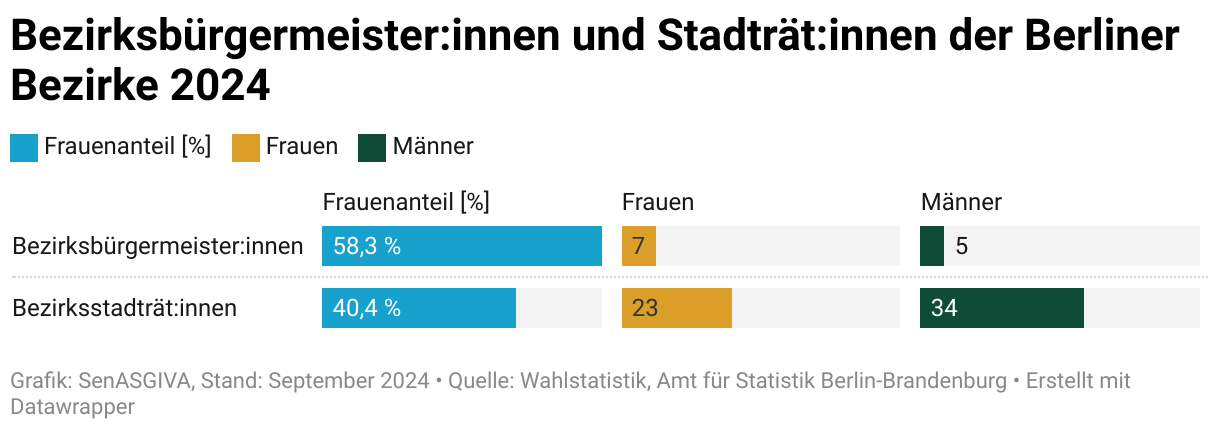 Bei den Bezirksstadträtinnen und Bezirksstadträten überwog 2024 die Zahl der Männer mit 34 zu 23 Frauen. Bürgermeister gab es mit 5 etwas weniger als Bürgermeisterinnen (7).