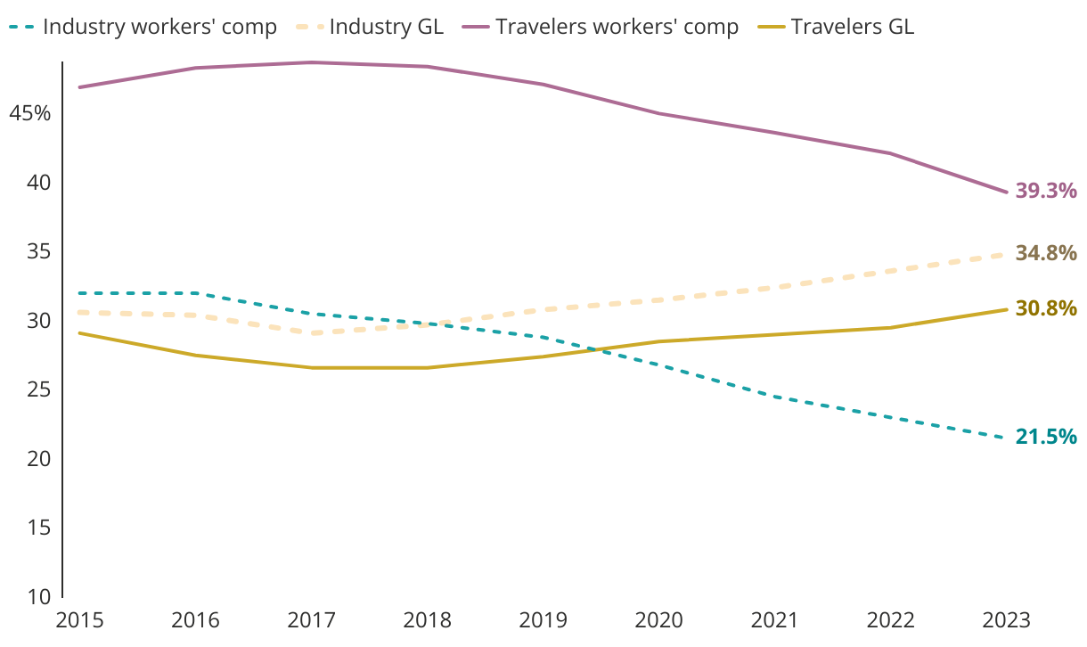 Workers' compensation and general liability reserves as a % of total commercial reserves