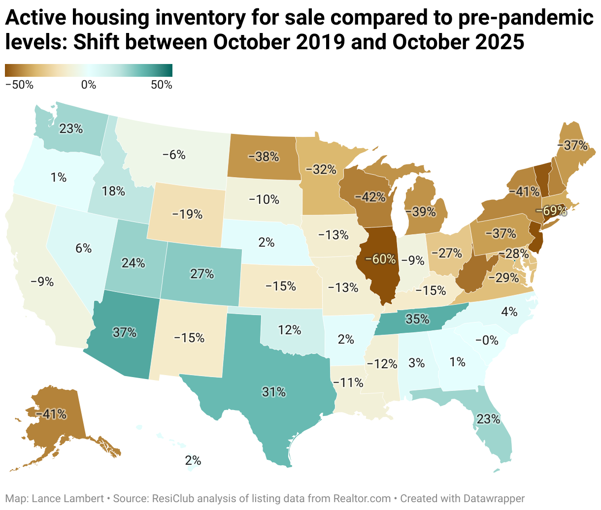 Active housing inventory for sale compared to pre-pandemic levels: Shift between October 2019 and October 2025