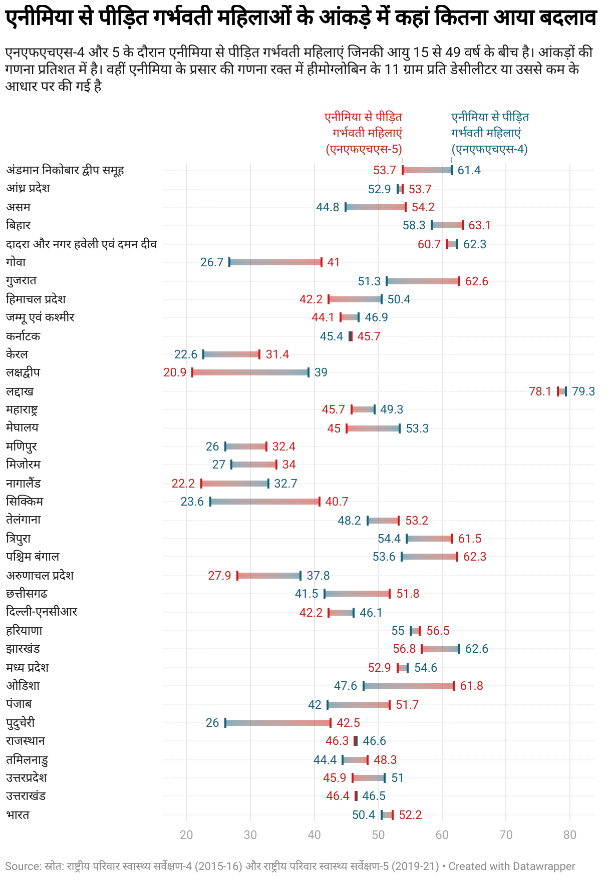 एनएफएचएस-4 और 5 के दौरान एनीमिया से पीड़ित गर्भवती महिलाएं जिनकी आयु 15 से 49 वर्ष के बीच है। आंकड़ों की गणना प्रतिशत में है। वहीं एनीमिया के प्रसार की गणना रक्त में हीमोग्लोबिन के 11 ग्राम प्रति डेसीलीटर या उससे कम के आधार पर की गई है