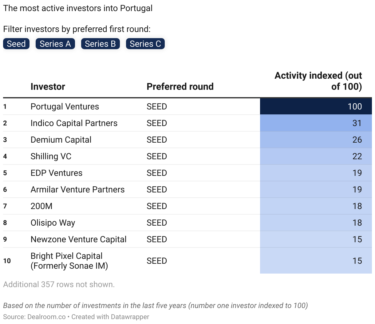 The most active investors into Portugal Filter investors by preferred first round: Seed Series A Series B Series C