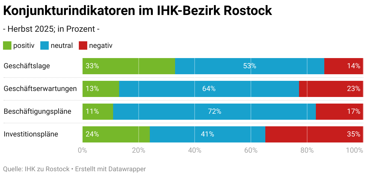 Das Balkendiagramm zeigt die Konjunkturindikatoren im IHK-Bezirk Rostock für Herbst 2025. Die Geschäftslage wird überwiegend positiv eingeschätzt. Erwartungen, Beschäftigungs- und Investitionspläne sind mehrheitlich neutral, mit teils deutlichen negativen Anteilen.