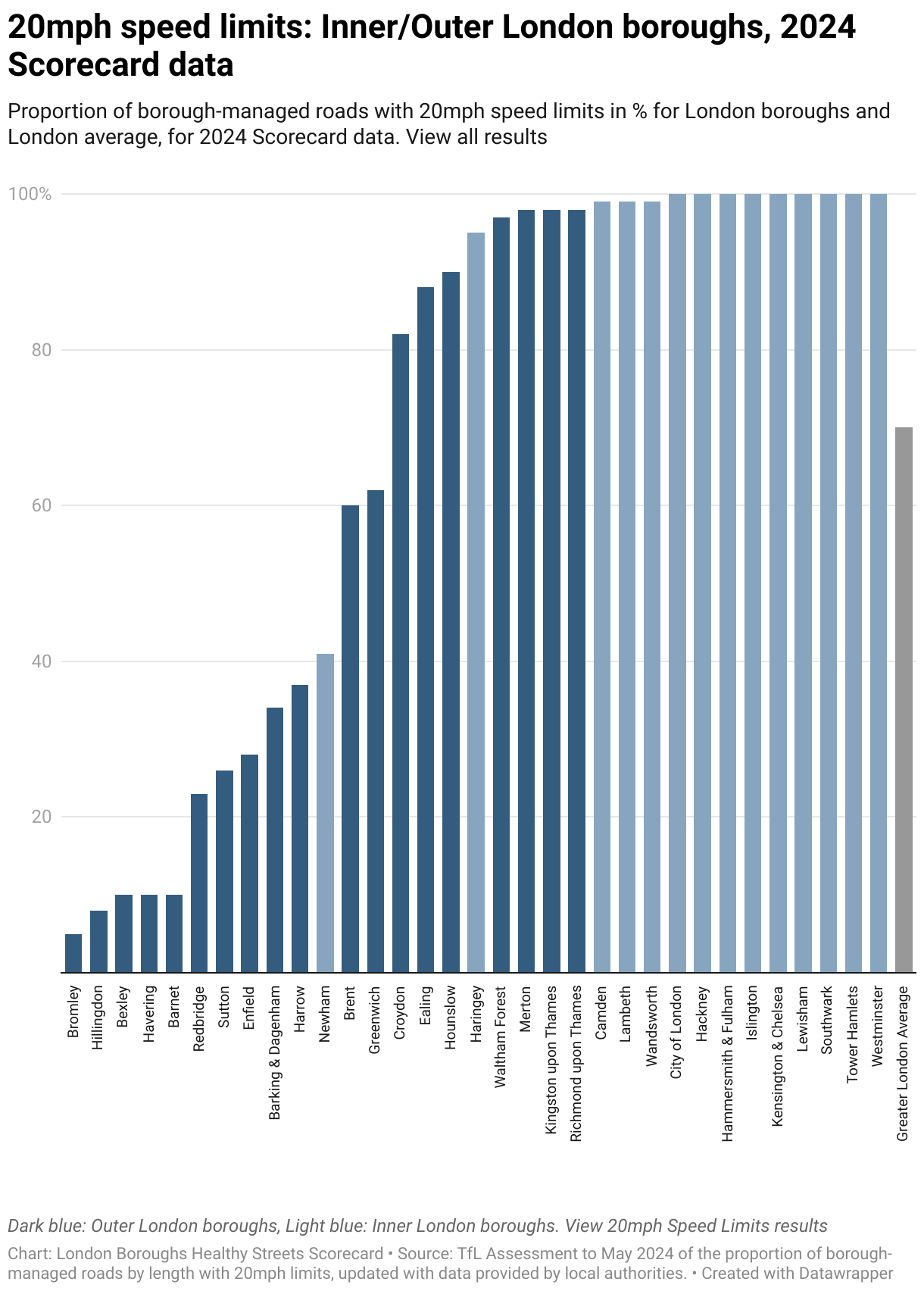 Proportion of borough-managed roads with 20mph speed limits in % for London boroughs and London average, for 2024 Scorecard data. View all results
