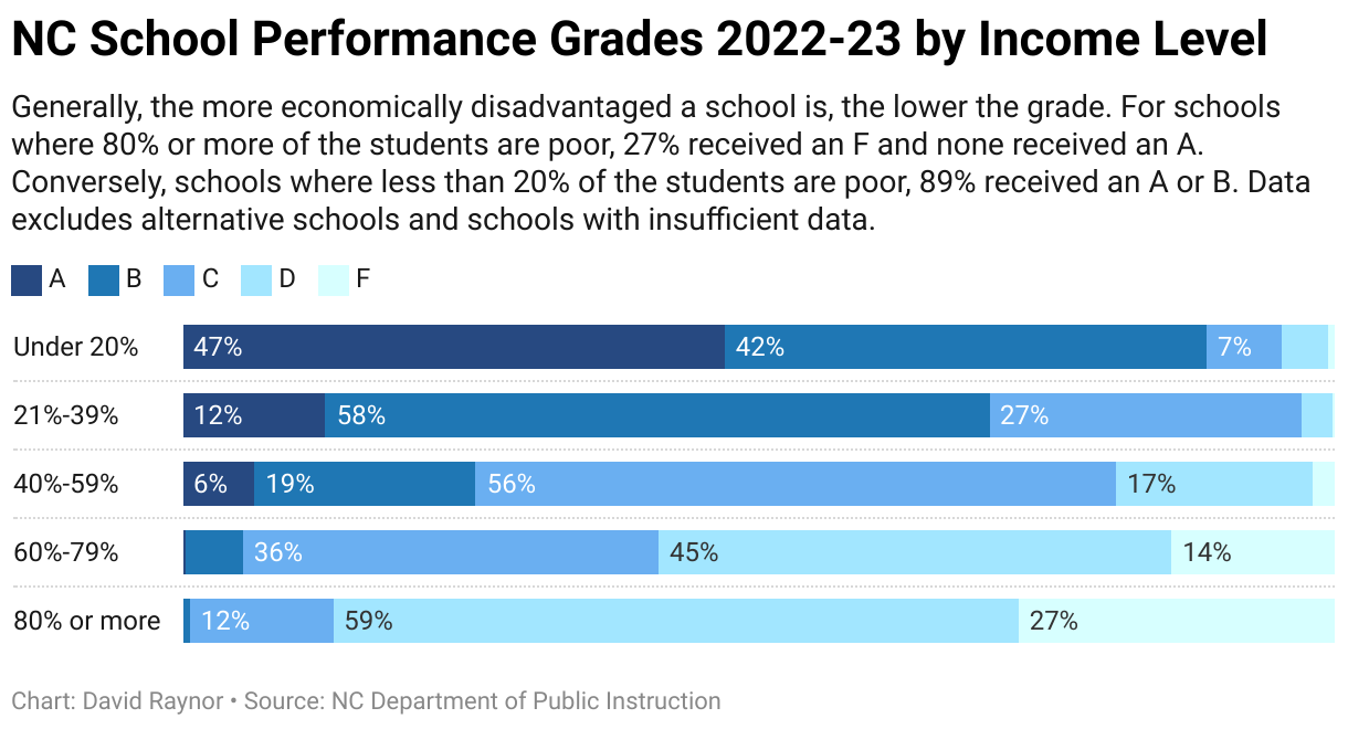 Generally, the more economically disadvantaged a school is, the lower the grade. For schools where 80% or more of the students are poor, 27% received an F and none received an A. Conversely, schools where less than 20% of the students are poor, 89% received an A or B. Data excludes alternative schools and schools with insufficient data.