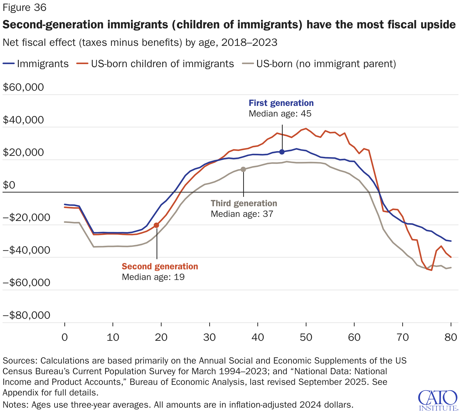 Net fiscal effect (taxes minus benefits) by age, 2018–2023