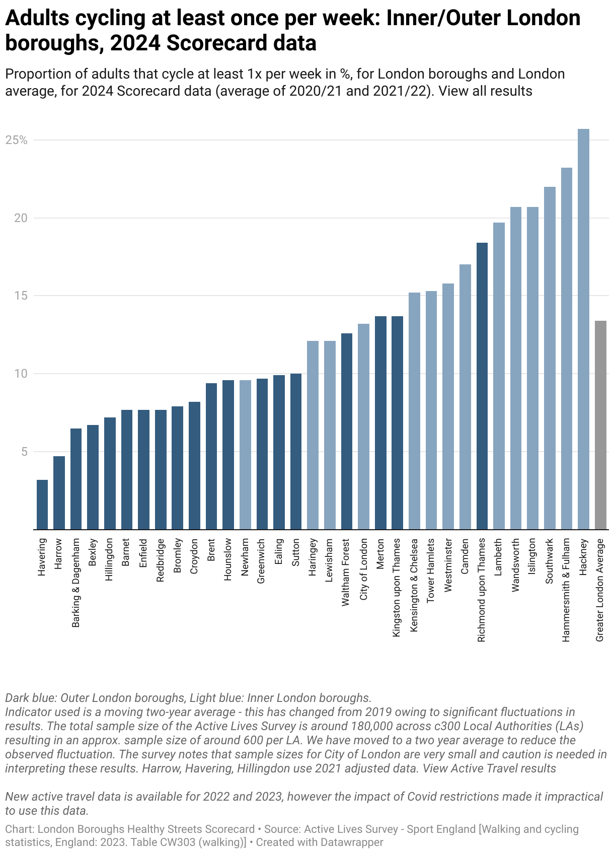 Adults cycling at least once per week: Inner/Outer London boroughs, 2024 Scorecard data
