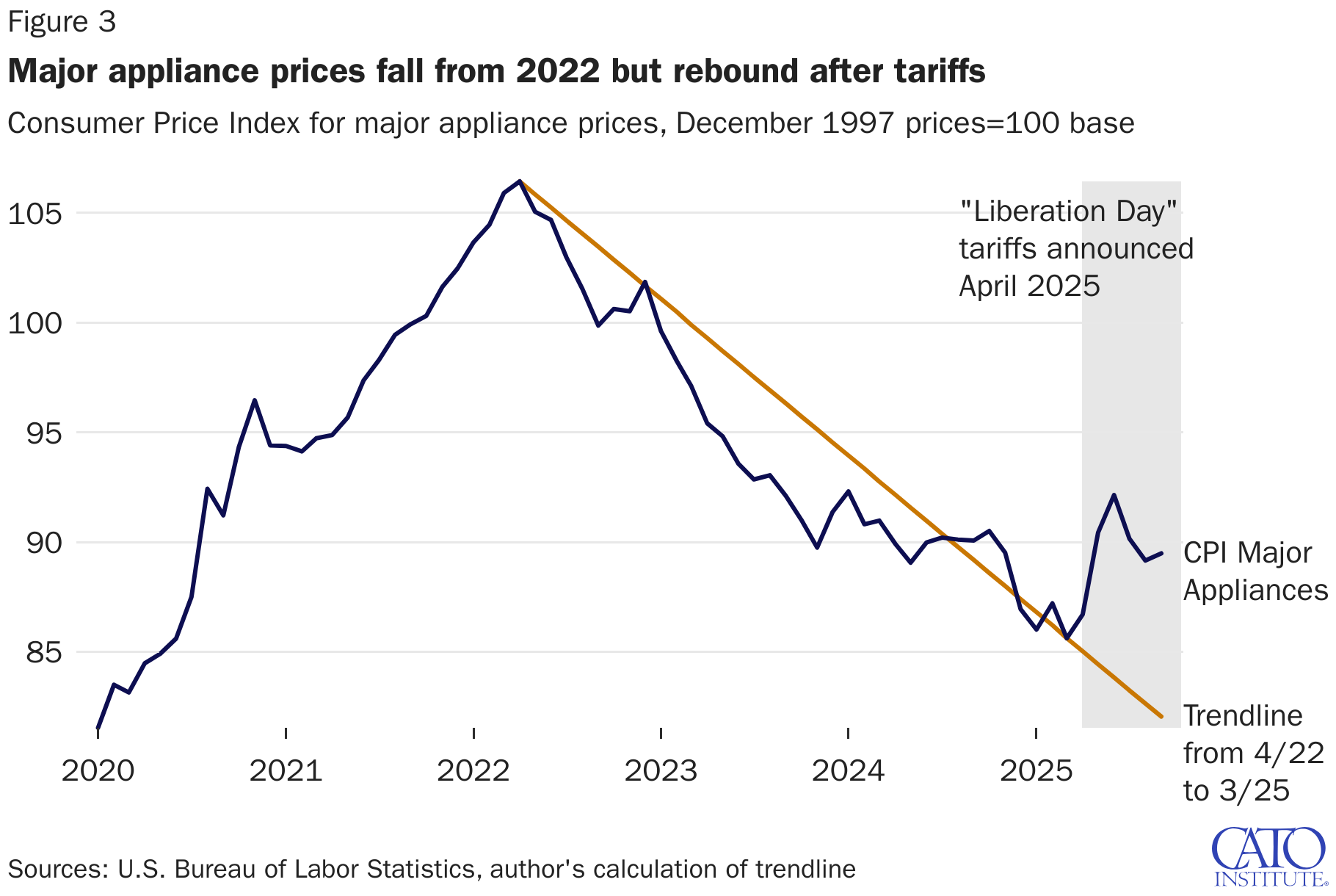 Consumer Price Index for major appliance prices, December 1997 prices=100 base