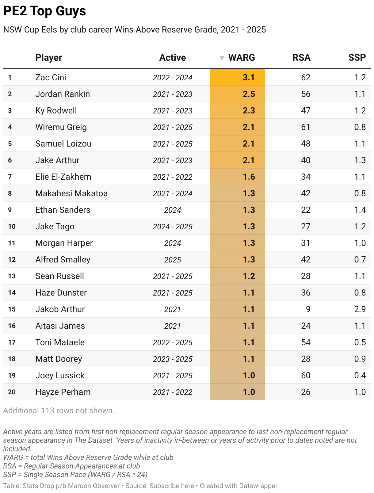 NSW Cup Eels by club career Wins Above Reserve Grade, 2021 - 2025