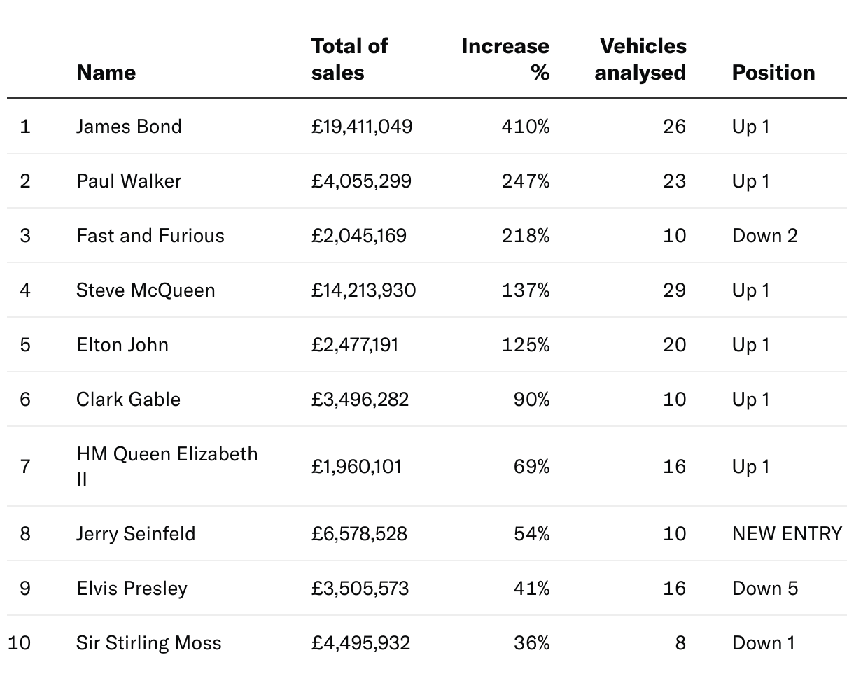 Celebrities or movie/TV franchises that have influenced car values the most (over seven examples).
