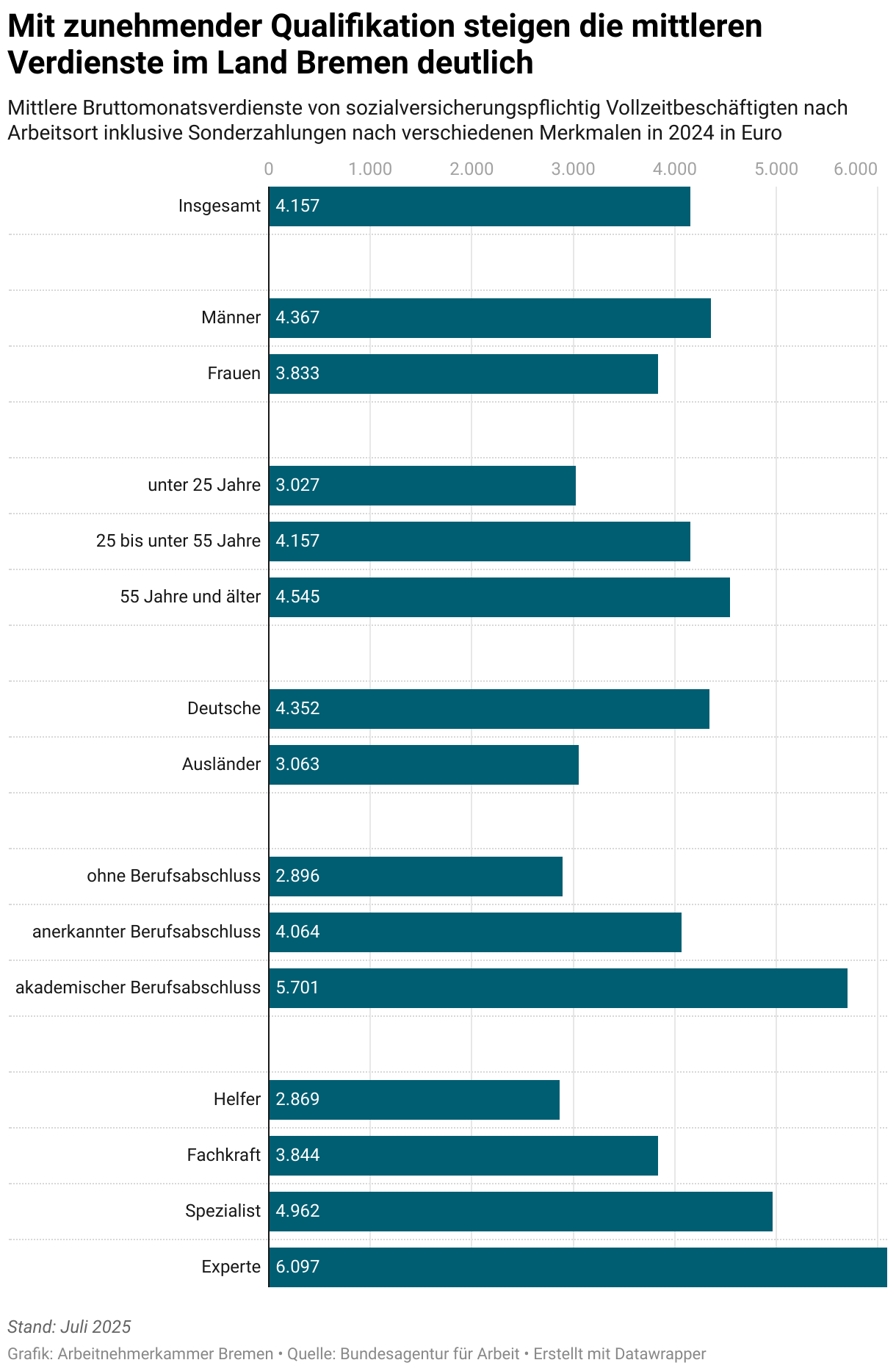 Mit zunehmender Qualifikation steigen die mittleren Verdienste im Land Bremen deutlich