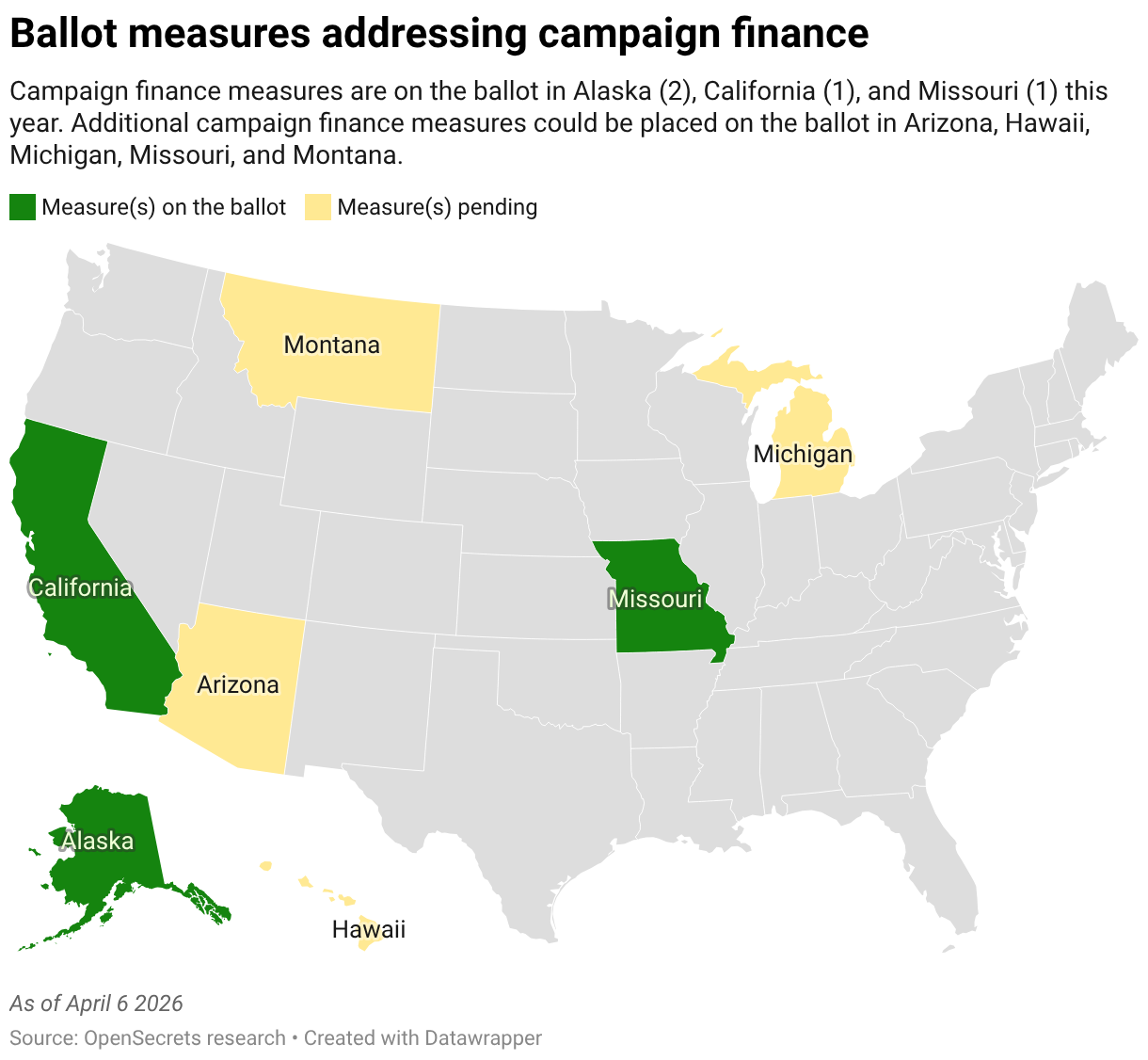 Campaign finance measures are on the ballot in Alaska (2), California (1), and Missouri (1) this year.