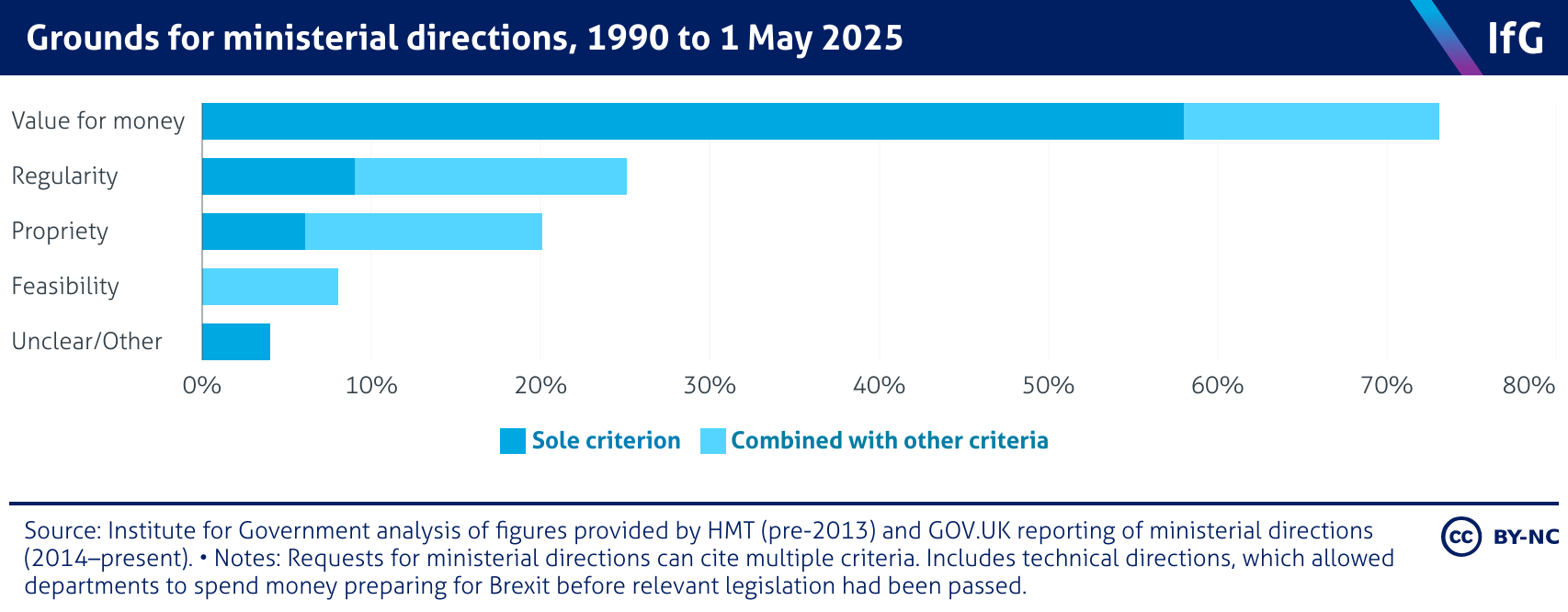 A stacked bar chart from the Institute for Government showing grounds for ministerial directions since 1990. Around three-quarters of ministerial directions have been on the grounds of value for money, either as a sole criterion or combined with other criteria. Feasibility has been rarely used, and has not been used as a sole criterion for a ministerial direction.