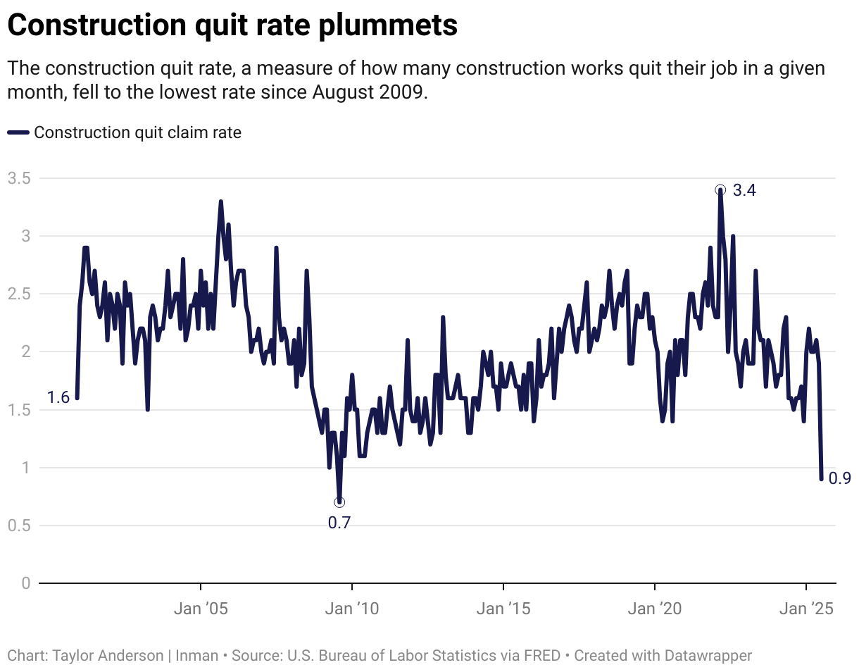 The construction quit rate, a measure of how many construction works quit their job in a given month, fell to the lowest rate since August 2009.