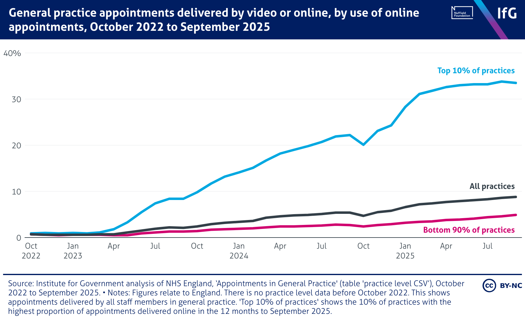 A line chart from the Institute for Government showing general practice appointments delivered by video or online, by use of online appointments, October 2022 to September 2025, where digital delivery has expanded rapidly but unevenly across practices. The top 10% of practices saw a sharp rise from under 1% to 33.5% of appointments delivered online, while the bottom 90% remained below 5% across the time period. The average across all practices is 8.8% as of September 2025.