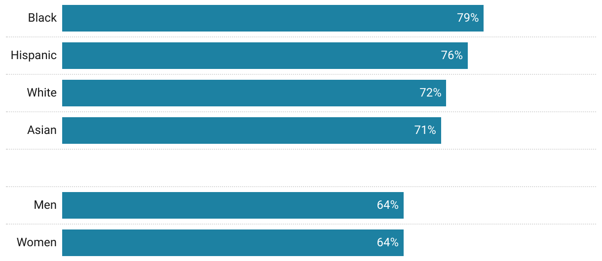 Among students with similar credentials, Black and Hispanic students go to college at higher rates than white and Asian students — reversing the typical gaps in college-going rates. Men and women with similar academic résumés go to college at about the same rate.