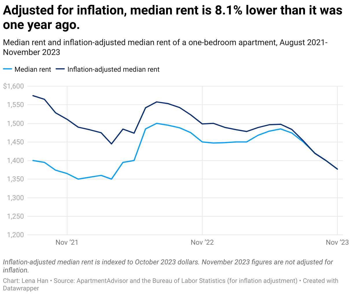 Median rent and inflation-adjusted median rent of a one-bedroom apartment, August 2021-November 2023