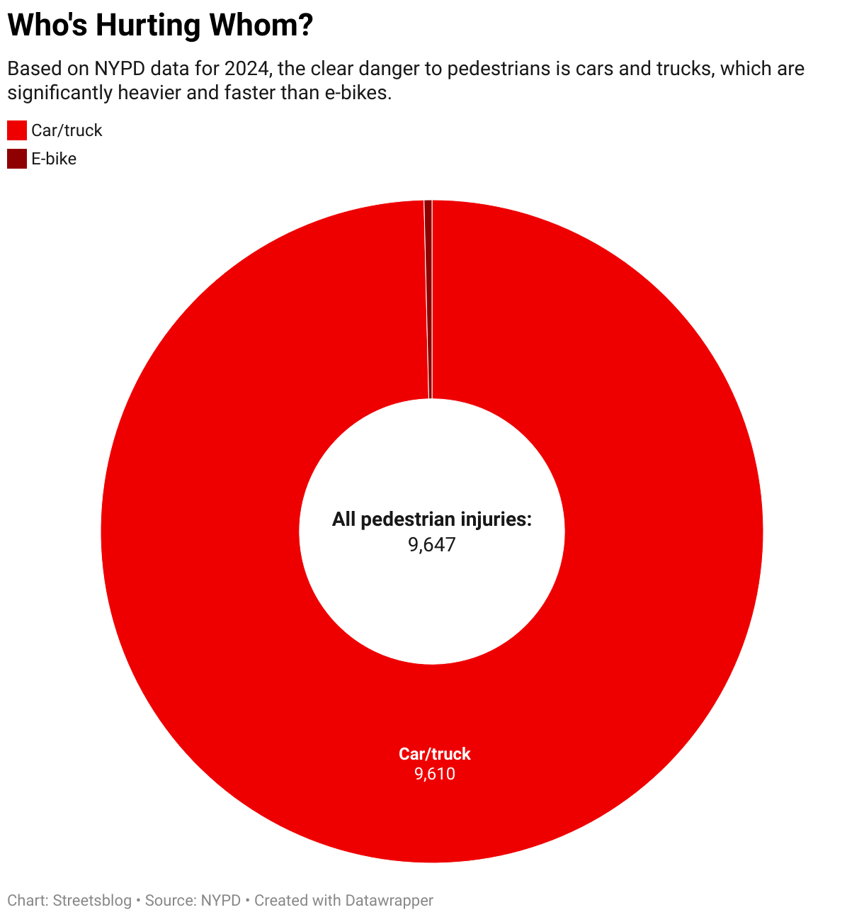 Based on NYPD data for 2024, the clear danger to pedestrians is cars and trucks, which are significantly heavier and faster than e-bikes.