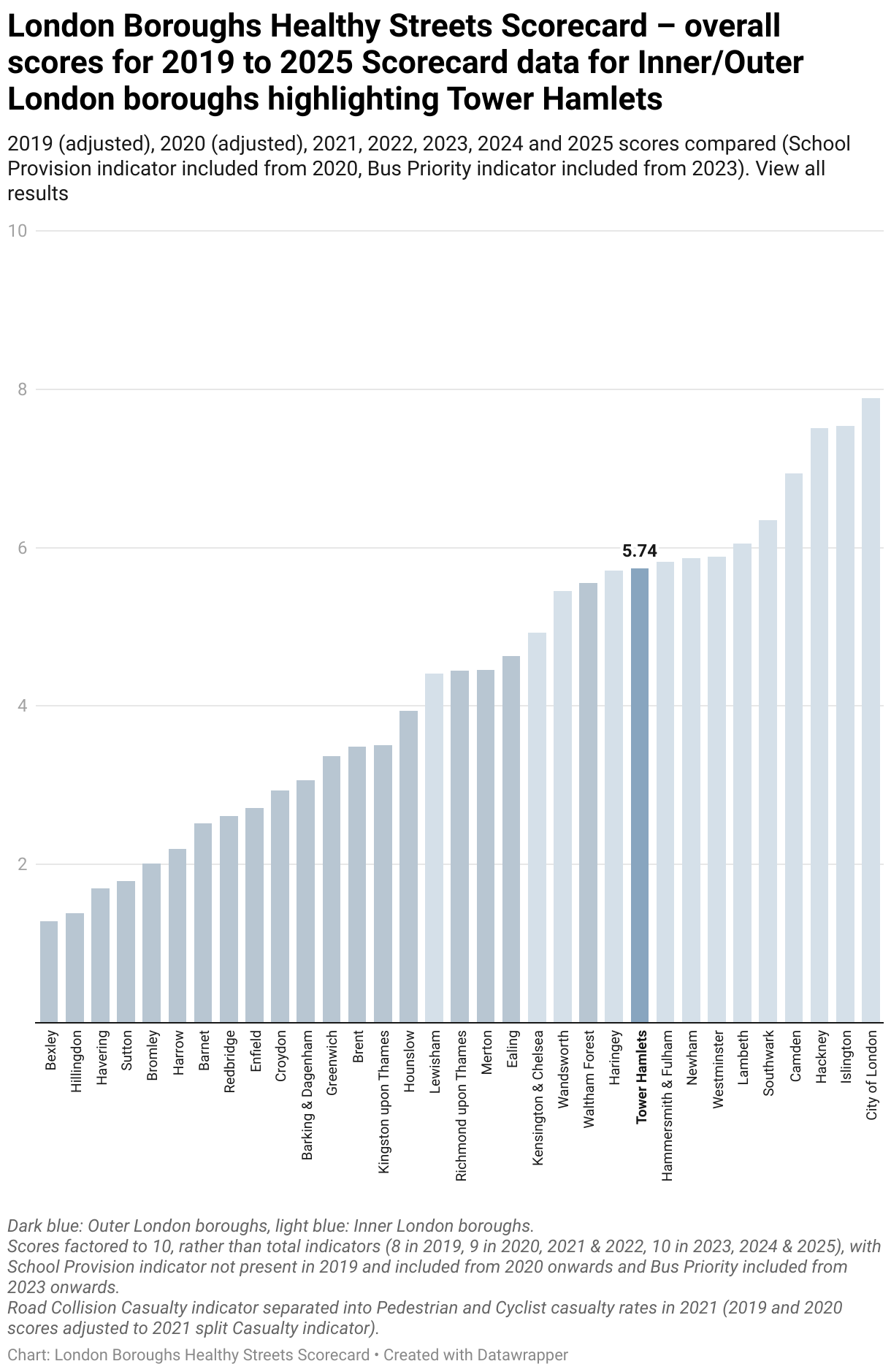 London Boroughs Healthy Streets Scorecard – overall scores for 2019 to 2025 Scorecard data for Inner/Outer London boroughs highlighting Tower Hamlets