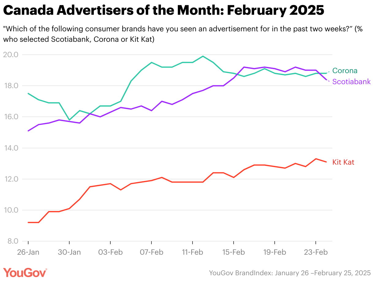 "Which of the following consumer brands have you seen an advertisement for in the past two weeks?” (% who selected Scotiabank, Corona or Kit Kat)