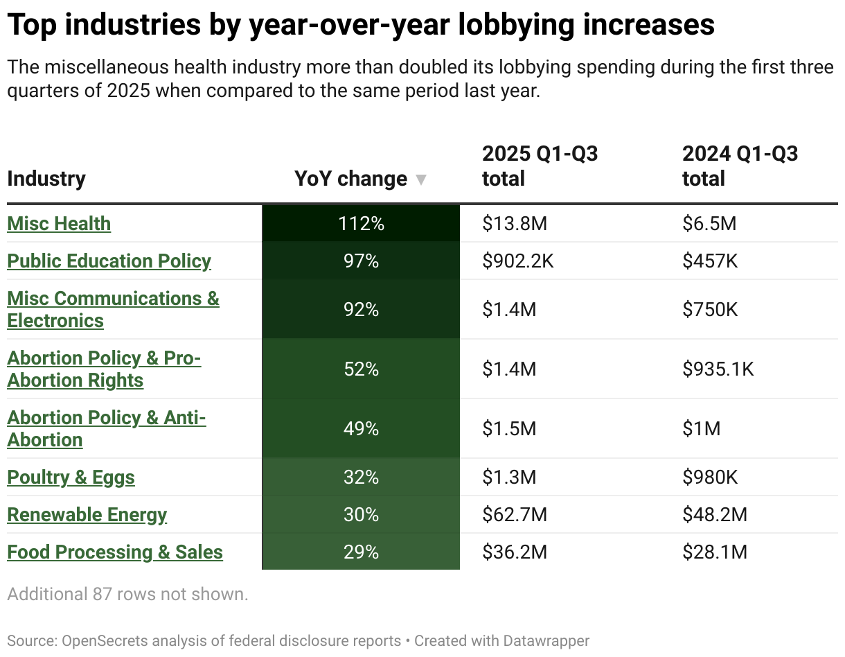 The miscellaneous health industry more than doubled its lobbying spending during the first three quarters of 2025 when compared to the same period last year.