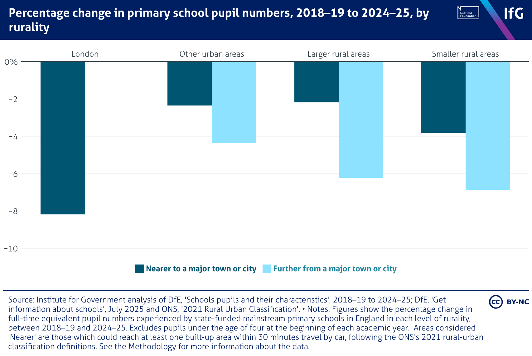 A column chart from the Institute for Government showing the percentage change in primary school pupil numbers, 2018–19 to 2024–25, by rurality, where pupil numbers have fallen across all areas. The sharpest decline was in London (–8.2%), but this is not part of a wider urban trend. The other biggest drops are all in areas that are further from major towns or cities, with the second biggest in smaller rural areas further from major towns or cities (–6.9%) .