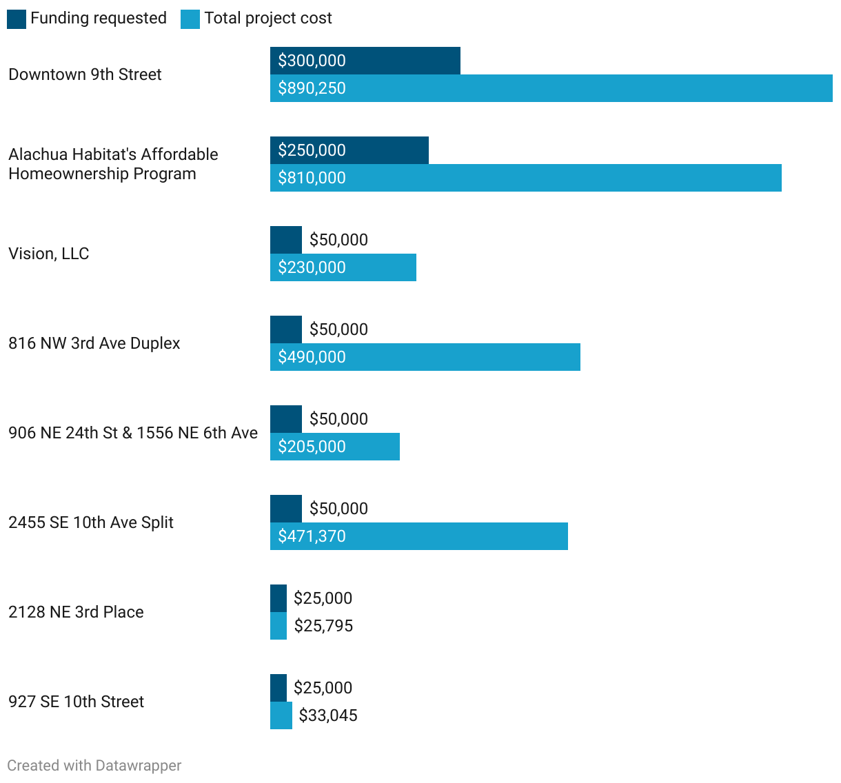 Affordable housing projects often require multiple funding sources. This chart compares the city funding requested with the total project cost, showing how these developments bridge financial gaps to move forward.